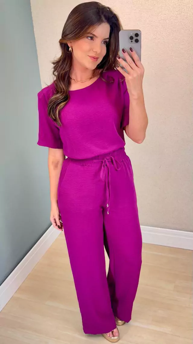 Este elegante conjunto é composto por uma blusa frente única assimétrica e uma calça pantalona confeccionados em tecido kalli. A blusa apresenta um design moderno e assimétrico, proporcionando um toque de originalidade ao visual. Com detalhe frente única, realça a área dos ombros e confere um estilo sofisticado.A calça pantalona, feita com tecido kalli, oferece uma silhueta fluida e elegante. A modelagem ampla das pernas proporciona movimento e conforto, enquanto o caimento alongado adiciona um toque de sofisticação.